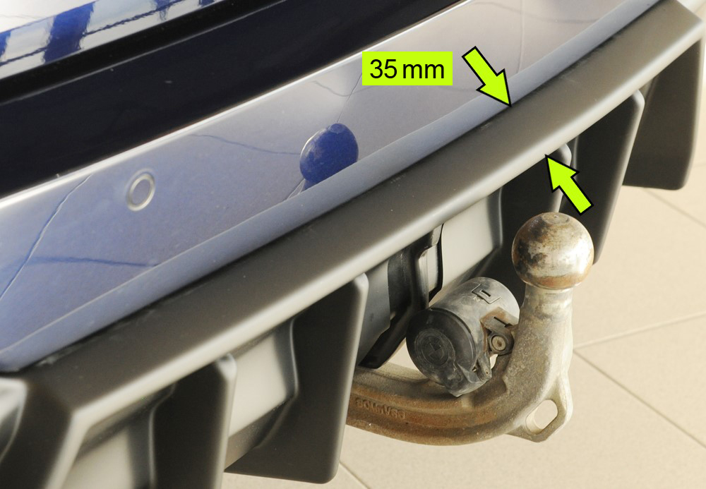Der Abstand zwischen Zugmaul der Anhängekupplung und dem Heckeinsatz reduziert sich bei Montage vom RIEGER-Heckeinsatz um ca. 3,5cm im Vergleich zum orig. Heckeinsatz. Da bei manchen Antischlinger-Anhängekupplungen das Zugmaul sehr groß ausgeführt ist, muss vor der Bestellung vom RIEGER-Heckeinsatz geprüft werden, ob der verbleibende Abstand zwischen Zugmaul und RIEGER-Heckeinsatz dann noch ausreichend ist.